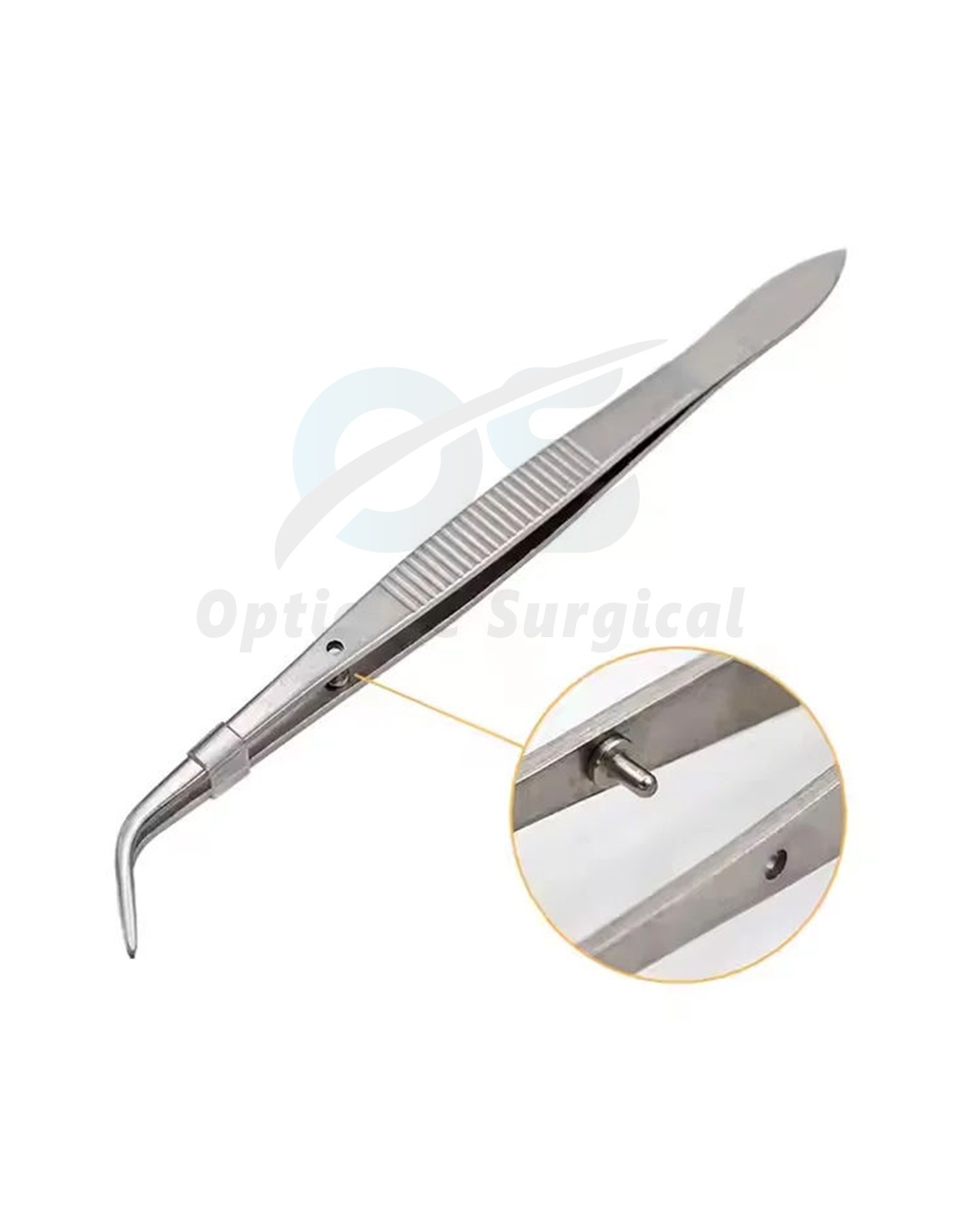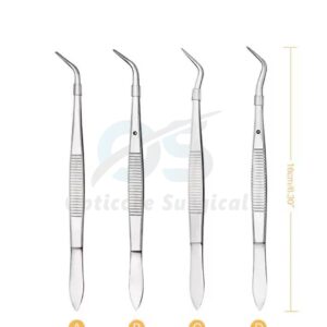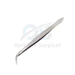 This model features angled working tips for improved access and visibility in confined oral spaces. The integrated locking pin mechanism allows the tweezers to remain securely closed when required, ensuring a steady grip on cotton pellets, gauze, membranes, sutures, or small surgical components without hand fatigue.